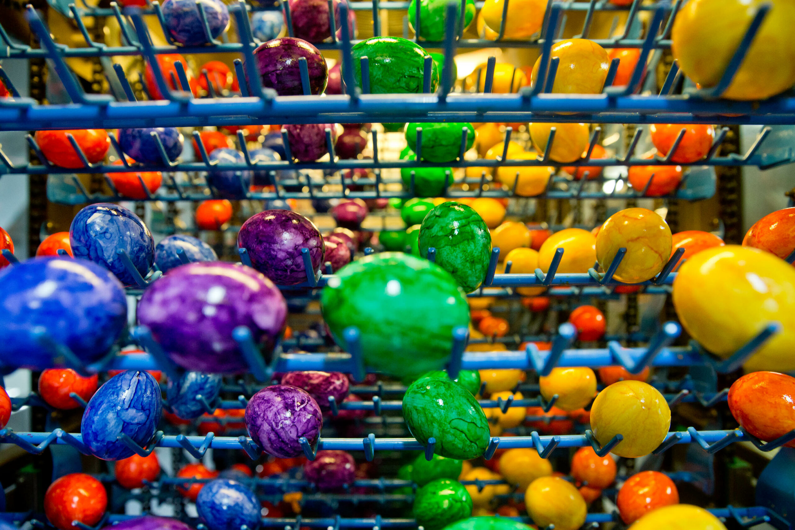 Während der Saison von Januar bis Ostern ist in unserer Eierfärberei Hochbetrieb. Dann verlassen ca. 4-5 Millionen bunte Eier den Hof und bescheren vielen Menschen eine schöne Osterzeit. Den Rest des Jahres dürfen sich alle Fans von bunten Eiern auf unsere Vespereier in Gelb und Rot freuen: Sie bringen Farbe auf jeden Frühstückstisch und jedes Vesperbrettchen.