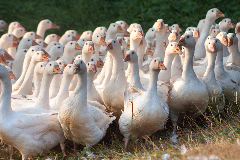 Jedes Jahr Ende Juli/Anfang August kommen die jungen Gänse als Küken auf den Geflügelhof nach Sommerkahl. Zunächst leben sie in geräumigen Freilaufställen auf Stroh, bis sie dann nach ihrer Aufzuchtphase täglich Auslauf auf den Maisfeldern haben.